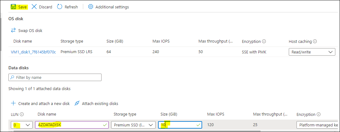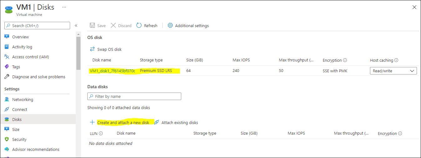 3. On Disk section one disk shown as the disk for OS and its is temporary disk. We lost data if we keep it on disk when we stop the Virtual Machine. Below on Same Panel, we have option to Create the Data disk highlighted as shown below.