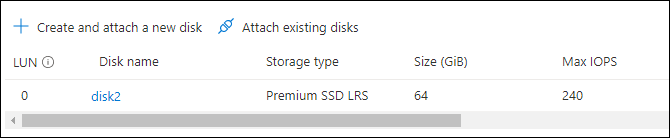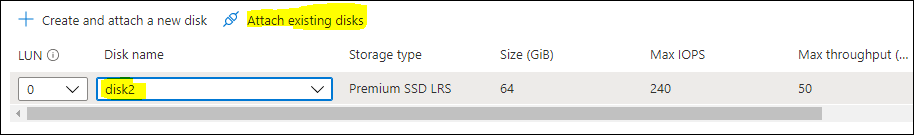 - Login in AZURE portal and go to your VM machine Disk section. We have mapped our VM with 64 GB Disk as “disk2”.