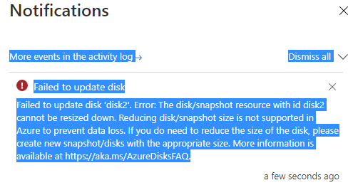 If we tried to reduce the disk for Azure platform then it will give following message: