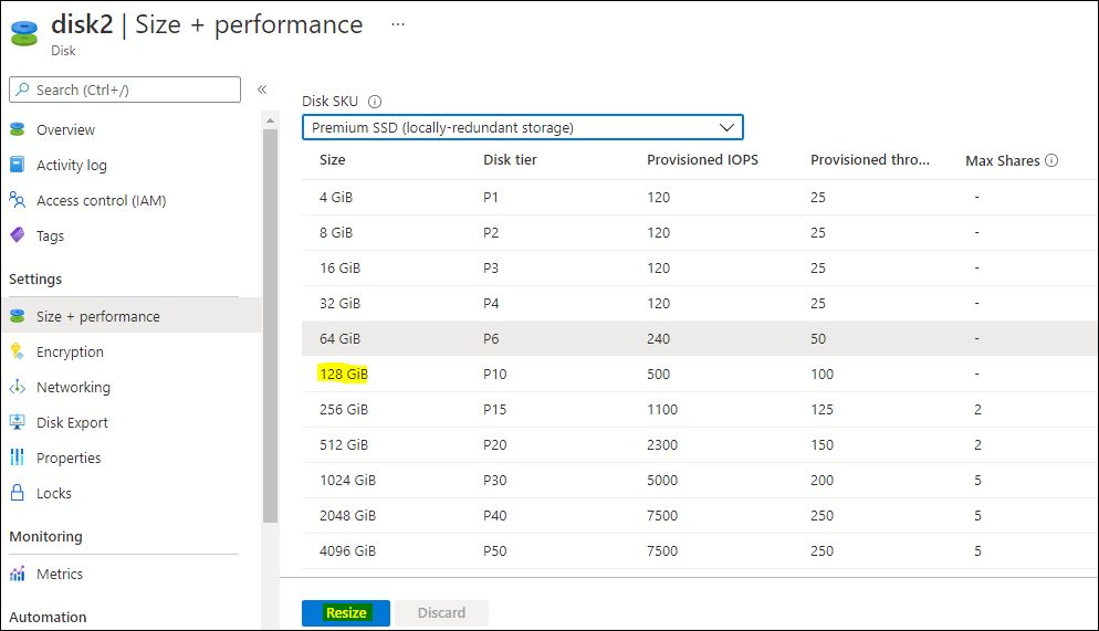 5. Click on Disk2 and go to Size + performance. choose 128 GB and press RESIZE button.