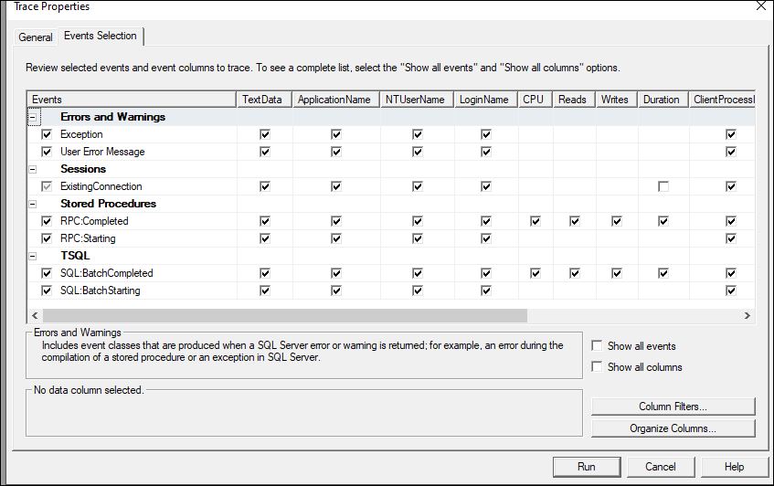 6. Expand the Errors and Warnings event category and select : Exception and User Error Message.