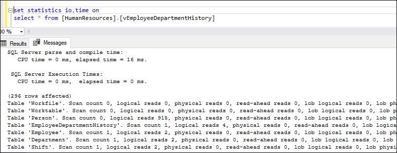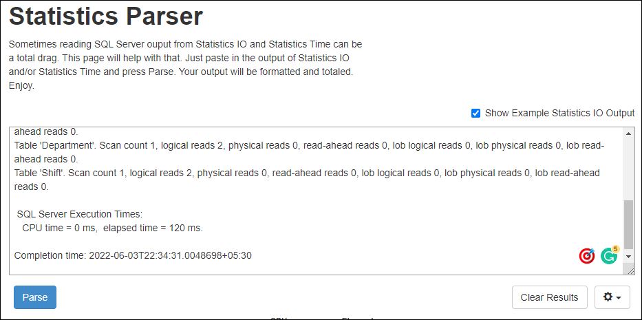 Example showing the use of the Statisticsparser website will make the output readable format for statistic io or time of SQL Server. I executed the SQL Query in SQL Management Studio and took the message part and paste it into the Statsticsparser website text box and it will generate a readable format for it as shown in the snapshot below: