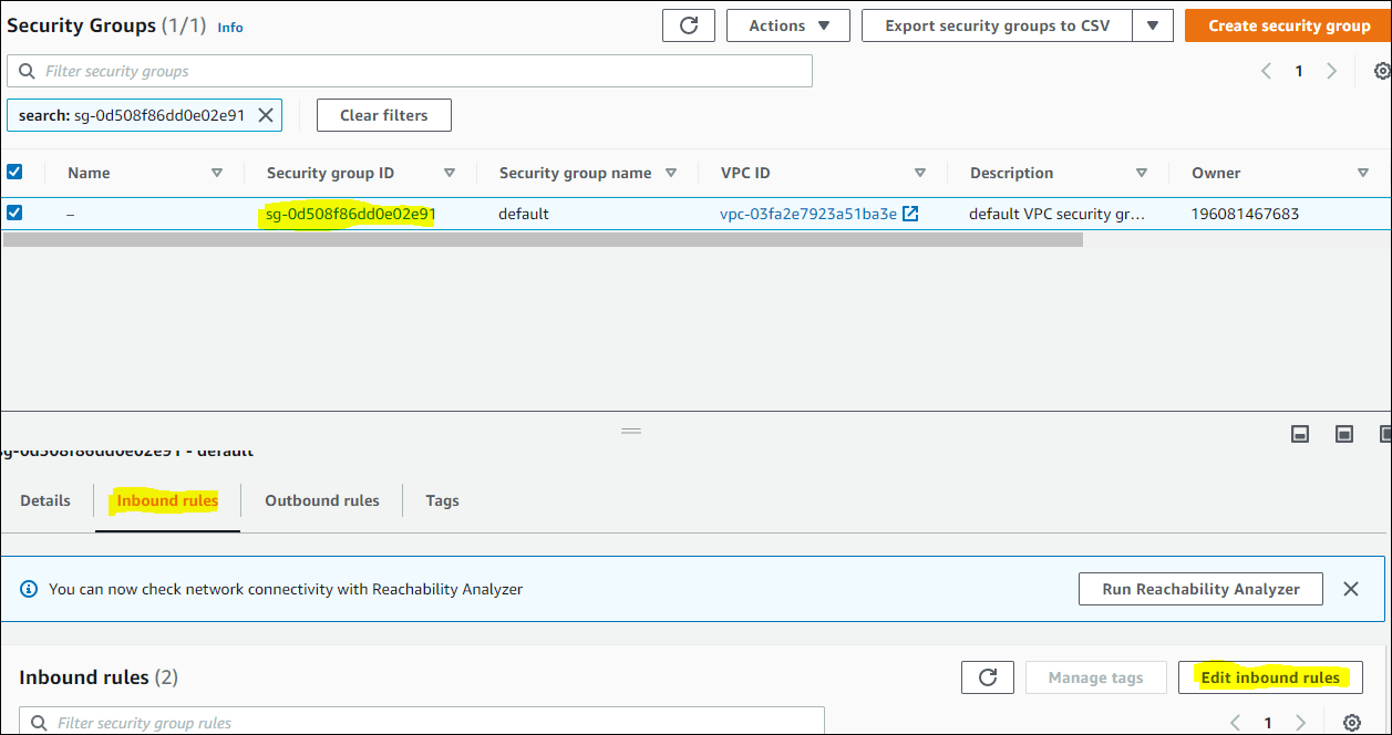 3. You will move to the Security Group page and then click on the Security group to open INBOUND Rules Connection setting –> Edit Inbound Rules