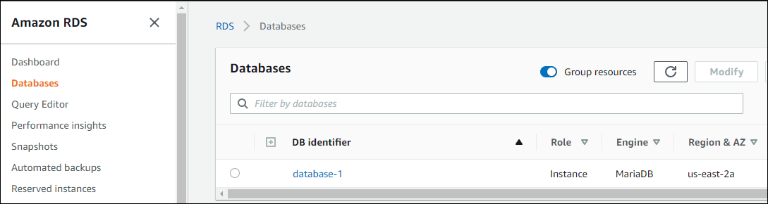 - Go to the RDS Service and Select the Database.