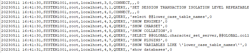 | Query | Log queries executed and their results in plain text, including failed queries due to syntax or permission errors |