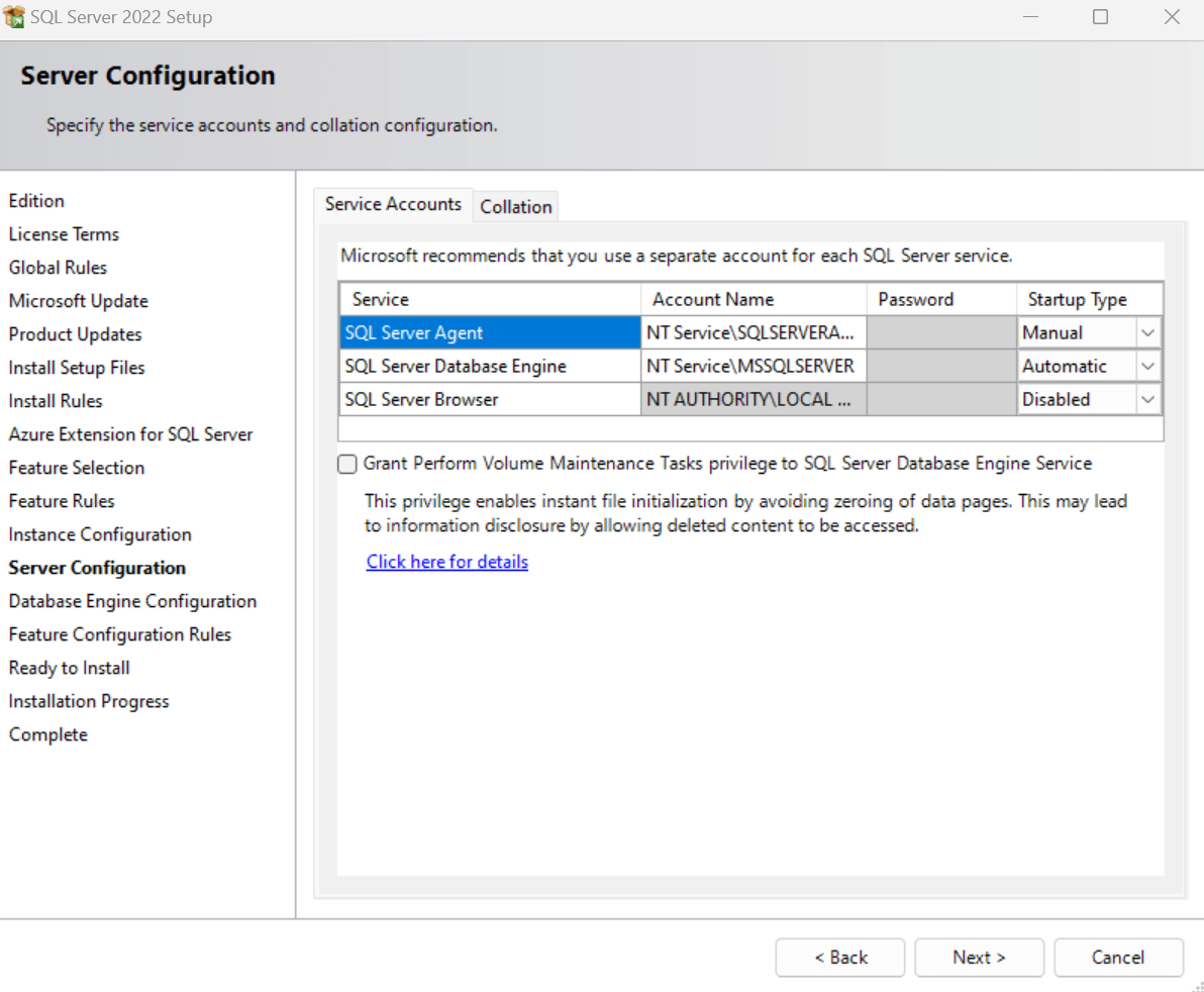 21. Server configuration has service accounts details which service are installed on Windows machine.