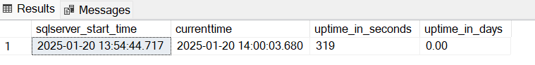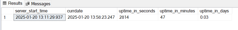 DATEDIFF(SECOND, sqlserver_start_time, GETDATE()):- Calculates the uptime in seconds.
